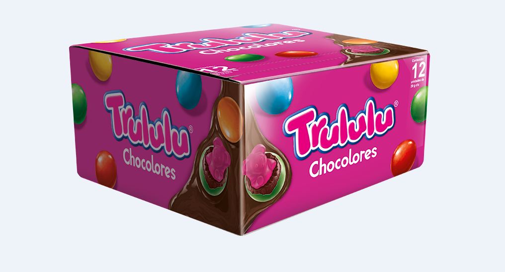 Dulce de goma recubierto con chocolate Chocolores, caja por 12 unidades.