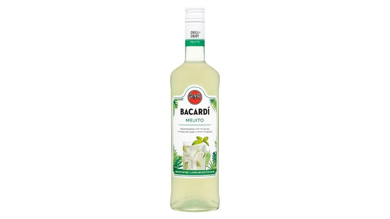 Refrescante coctel listo para servir, elaborado con ron Bacardi, hierbabuena y un toque cítrico, ideal para disfrutar frío.