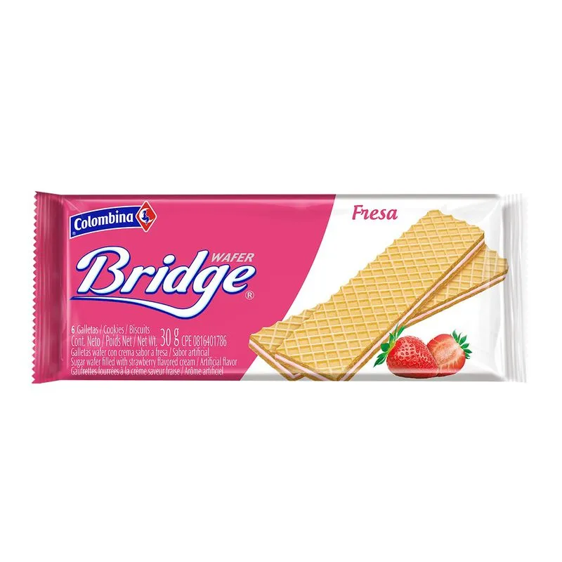 Galletas tipo wafer Bridge en presentación de 10 unidades de 30 g cada una, con diferentes sabores.