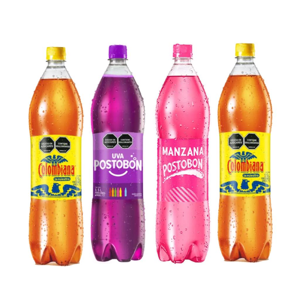 Botellas de 2.5 litros de gaseosa Postobón en sabores surtidos, pack de 8 unidades.